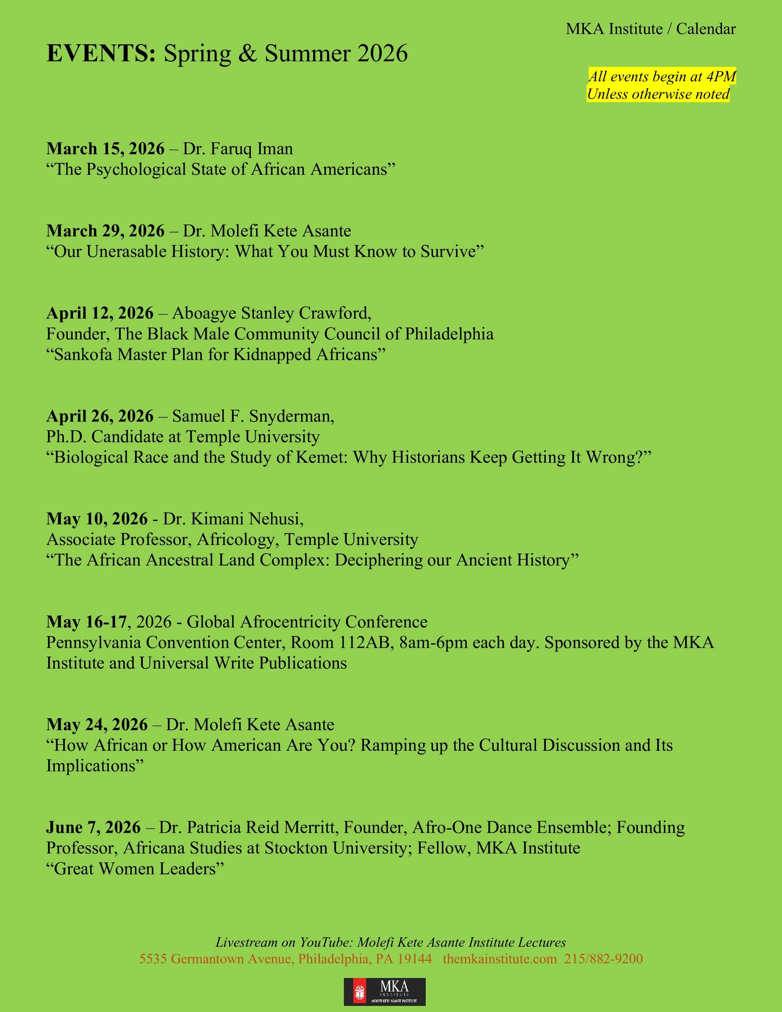 HomeAbout UsMissionExperts Calendar & Special Events Lectures At a Glance Schedule Special Events Global Afrocentricity 2026 Attend Registration Visit MKAI Photo GallerySupport MKAStaff & Contact